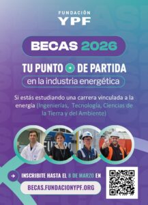 Informamos que hasta el 8 de Marzo estará abierta la convocatoria para las Becas Fundación YPF 2026, destinadas a estudiantes de carreras vinculadas a las Ingenierías, Tecnología, Ciencias de la Tierra y Ambiente de Universidades Nacionales Públicas, con sede en Buenos Aires, CABA, Neuquén, Mendoza, Río Negro, Chubut, Córdoba, Santa Fe, San Juan y Salta.