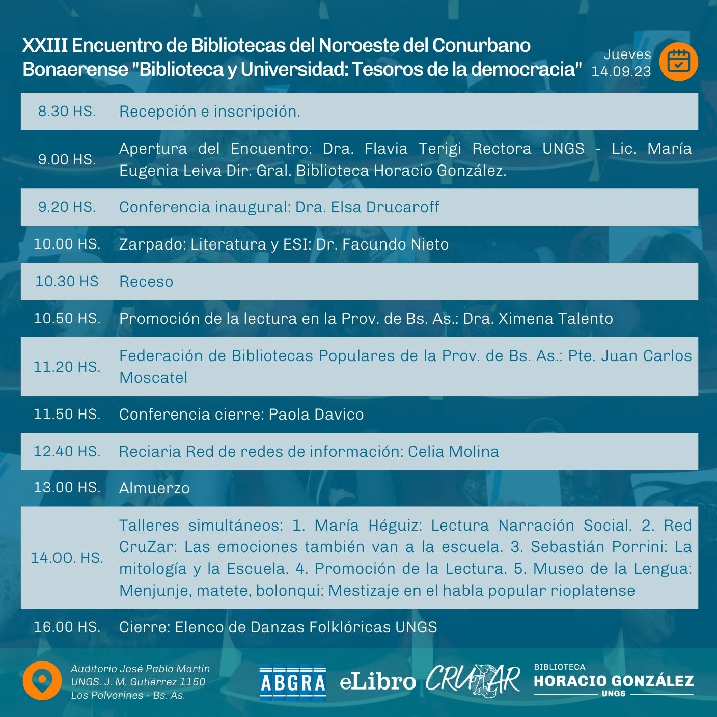 Este vigésimo tercer Encuentro, bajo el lema "Biblioteca y Universidad. Tesoros de la democracia", en el marco de los 30 años de la UNGS y los 40 años de la democracia; se realizará en el Campus de la Universidad Nacional de General Sarmiento, el jueves 14 de septiembre próximo, a partir de las 08.30 horas. Nos acompañará en la conferencia inaugural la escritora, profesora y crítica argentina Elsa Drucaroff.