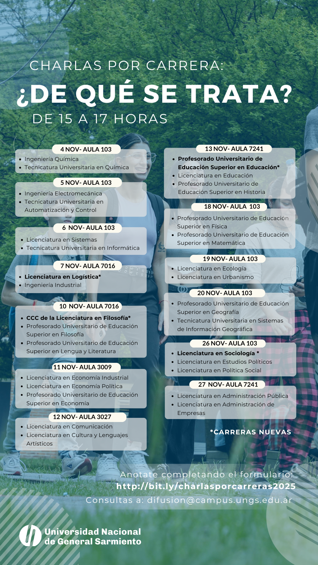 El cronograma incluye charlas sobre las nuevas carreras que comenzarán a dictarse en 2026: la Licenciatura en Logística, la Licenciatura en Sociología, el Profesorado de Educación Superior en Educación y la Licenciatura en Filosofía (Ciclo de Complementación Curricular).