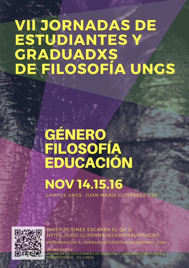 Bajo la temática "Género, Filosofía y Educación", el miércoles 14, jueves 15 y viernes 16 de noviembre se realizarán en el Campus de la UNGS las VII Jornadas de Estudiantes y Graduadxs de Filosofía.
