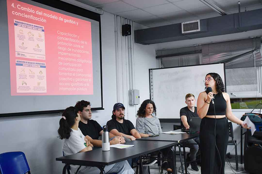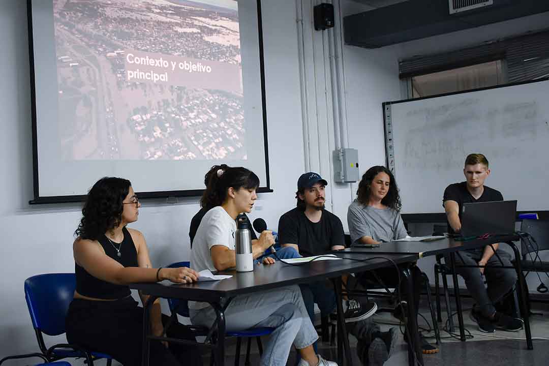 Como primera actividad de la jornada, se presentó un documento que elaboraron estudiantes de los diferentes talleres, con una mirada crítica sobre los efectos causados en el área metropolitana por las tormentas de mayo. El informe aporta reflexiones sobre causas y consecuencias de la situación, su relación con los modelos de planificación y gestión territorial vigentes y esbozo de propuestas preliminares para la actuación urbanística.