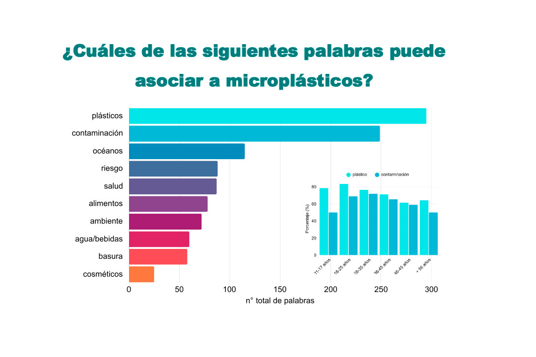 Las palabras más asociadas al término microplásticos fueron “plástico” y “contaminación”. “Esto refleja que la mayoría los percibe como una fuente de contaminación derivada del uso del plástico”, explican las investigadoras y agregan que “los más jóvenes (encuestados de 11 a 17 años) no establecen una relación tan directa entre microplásticos, plástico y contaminación, mostrando una menor percepción del impacto ambiental”.